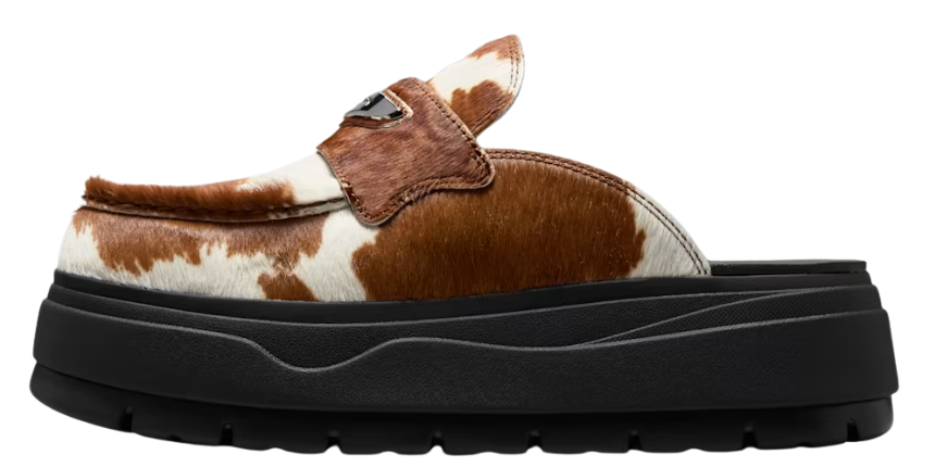 Probably the most divisive on the list, pony hair cow print drapes a loafer-style mule, finished with dress shoe stitching and a metallic Air Jordan badge. Chunky midsole, plush footbed, it’s a bold pivot into snoafer territory.