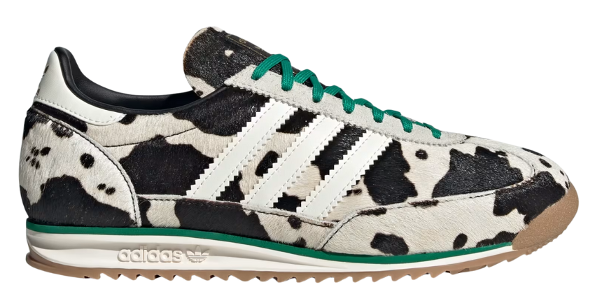 The SL 72 channels its ‘70s heritage with a fresh twist, dressed in a bold cow print with a pony hair finish. Green laces and gum soles give it a retro athletics vibe, but the upper is pure cow hide. A heritage silhouette gone wild.